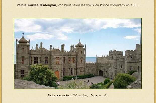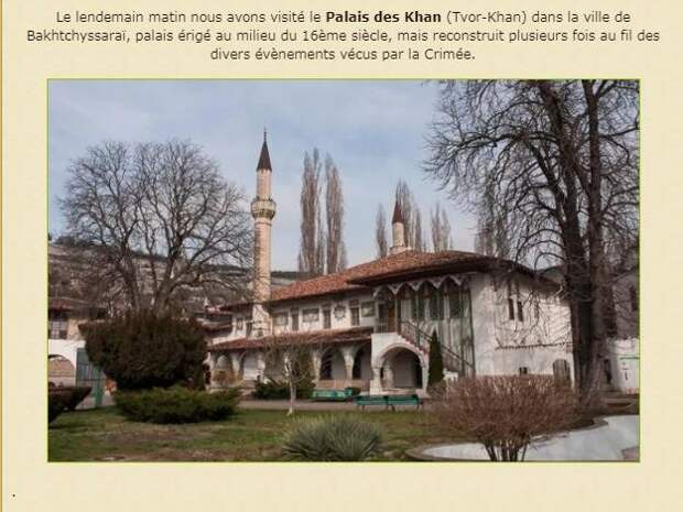 «Удивительный дворец 16 века. Два столетия в нем жили все крымские ханы. В честь дворца город получил название Бахчисарай. В переводе с турецкого и татарского языков — дворец в саду».