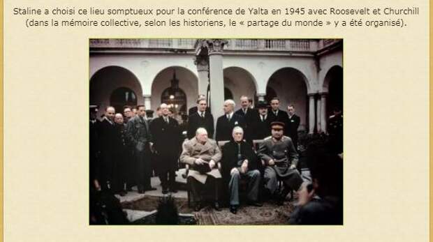 «Иосиф Сталин выбрал это замечательное место для проведения знаменитой Ялтинской конференции. На конференции Сталин, Рузвельт и Черчилль, на правах победителей во Второй Мировой войне, сделали великий передел мира».
