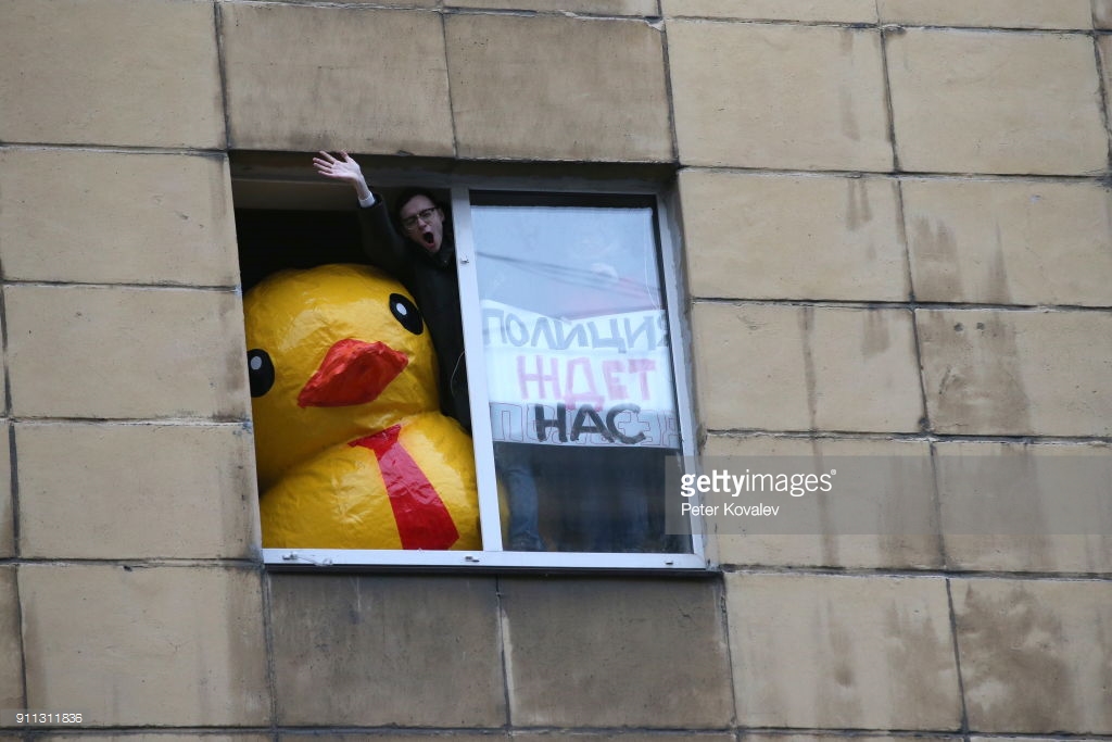 19. Тоже Петербург. В окне — огромная надувная уточка, с намёком на Дмитрия Медведева и фильм "Он вам не Димон".