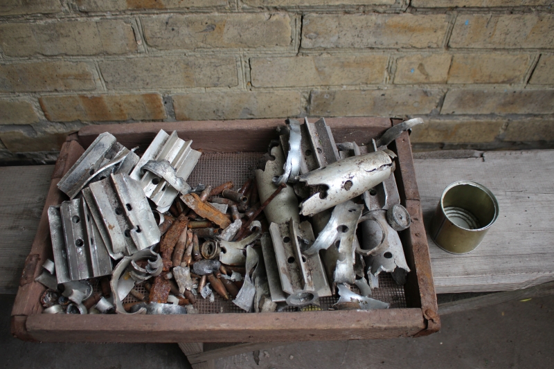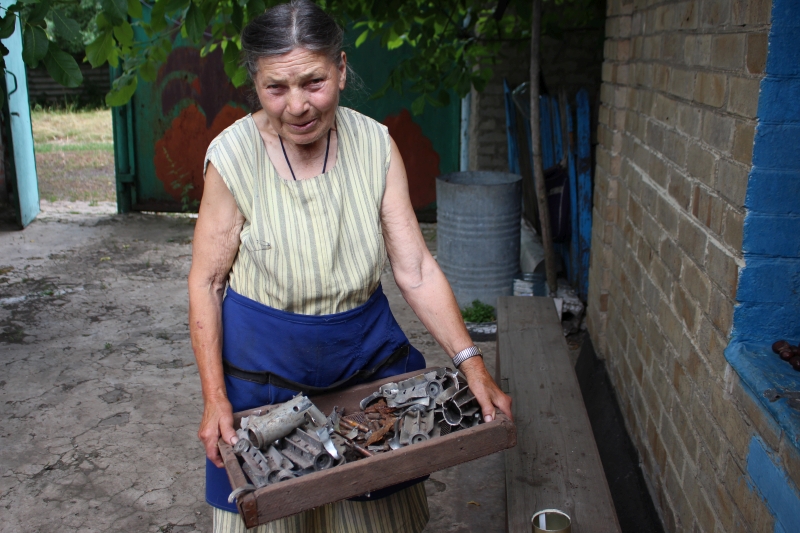 Дом Ксении Борисовны побит осколками, как водится, ни одного целого окна. Каждый день во дворе бабушка собирает «урожай»: «хвосты» снарядов, осколки, пули. Складывает их «в садок» - так она называет эту ёмкость. Зачем? Сама не знает. Просто складывает - и всё.