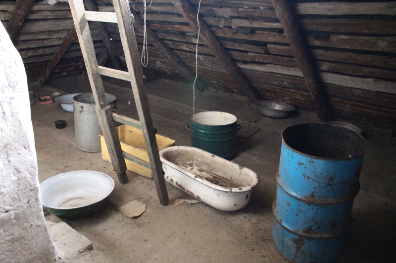 Вся крыша в дырах. Но залатать их не получается – как только украинские снайперы видят человека на крыше, сразу открывают огонь. Поэтому, чтобы вода во время дождей не заливала дом, бабушка под каждую дыру поставила ёмкость – где корыто, где старую ванну, где бидон, а где и маленькую пластиковую бутылочку. Помогает плохо, вода всё равно переливается и протекает в дом, но это всё же лучше, чем совсем ничего.