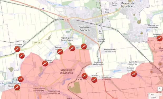 На южных подступах к самому Покровску интенсивные бои также продолжаются. Они ведутся в прилегающих к городу селах. Появилась информация об атаках российских войск на линии Песчаное – Котлино, что может указывать на планы по охвату агломерации Покровск – Мирноград с юго-запада и перерезания логистики ВСУ (через Котлово проходит железная дорога и автодорога Т-04-06 Покровск – Чаплино).
