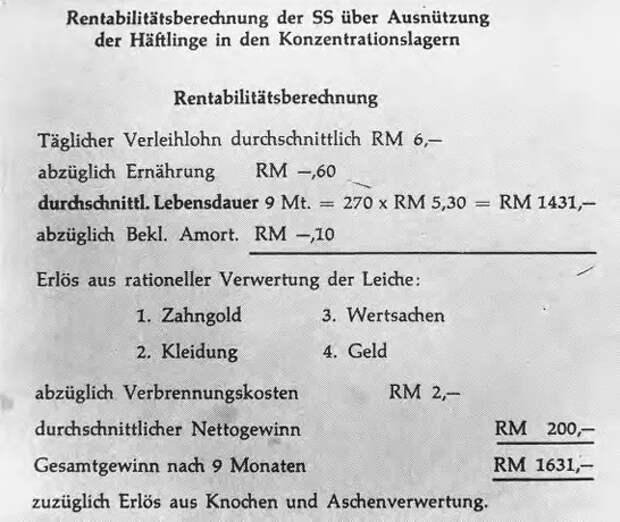 Не нужно думать, что это касалось только неарийцев. Например, программа Т4 по уничтожению психически больных предусматривала косвенную прибыль за счет сокращения затрат на содержание таких людей. Или вот, мне попадались упоминания о планах убивать в газовых камерах тяжело увечных немецких солдат, без рук и без ног, тоже чтобы сэкономить расходы.