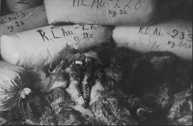 Мешки с женскими волосами из Аушвица. Обратите внимание, что мешки нумеровались, а их содержимое взвешивалось, и на мешках указан вес