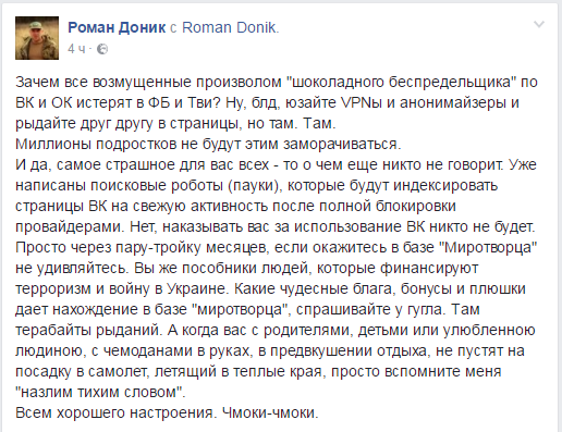 Сограждан - пользователей ВКонтакте - Доник, попирая любой, даже условный здравый смысл, фактически объявил пособниками "террористов" и теми, кто, оказывается финансирует войну, начатую Киевом. Ту самую войну, которую можно было не начинать, и которую, если уж начав, можно было окончить в два счета.