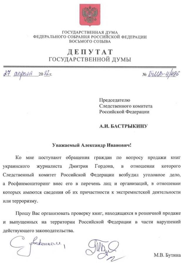 Мария Бутина пишет: «В социальных сетях ко мне обратились сразу несколько граждан по вопросу продолжающейся продажи книг Дмитрия Гордона. Напомню, украинский журналист призывал к вооруженному нападению на РФ и развязыванию агрессивной войны с применением ядерного оружия, после чего был внесен в российский реестр террористов и экстремистов. Такие вопросы требуют моментальной реакции.