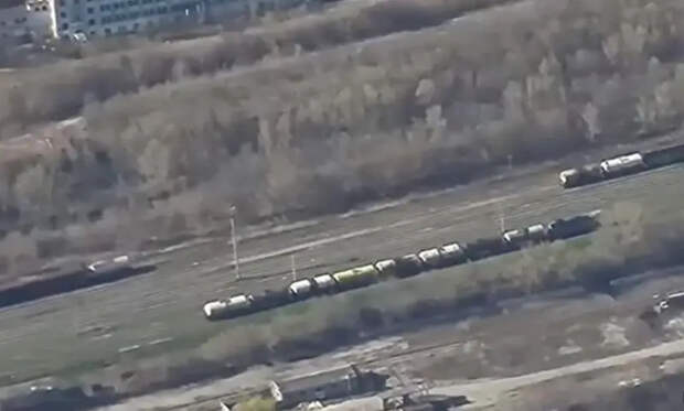 На них отчетливо виден практически весь цикл работы российских средств разведки и поражения. Первоначально беспилотник зафиксировал несколько составов с топливом, прибывших на станцию разгрузки, и несколько топливозаправочных машин украинской армии.
