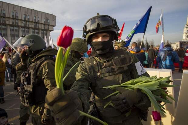 Вежливо, радостно, с цветами и песнями, с митингами по всему Крыму! И всё это вопреки США и на глазах у НАТО (которые наверняка всё видели, но не осмелились вмешаться, решив переварить остальную Украину).