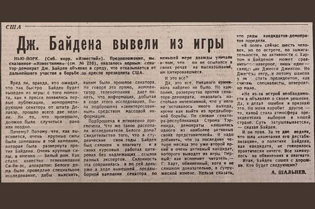 «Предположение, высказанное «Известиями» (см. № 258), оказалось верным: сенатор-демократ Дж. Байден объявил в среду, что отказывается от дальнейшего участия в борьбе за кресло президента США.