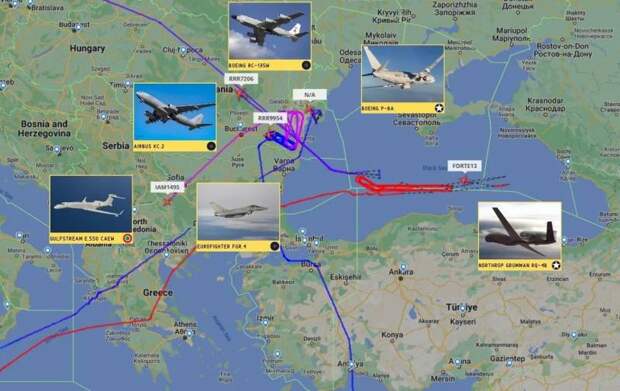 Североатлантический альянс заметно усилил ведение разведки над акваторией Черного моря. Накануне в этом регионе была зафиксирована деятельность сразу четырех разведывательных самолетов НАТО и одного топливозаправщика. По данным сервиса Flightradar24, вчера во второй половине близ российского побережья находились в воздухе британский Boeing RC-135W Rivet Joint, американский Boeing P-8A Poseidon, итальянский Gulfstream G550, американский БПЛА Northrop Grumman RQ-4B Global Hawk и британский заправщик Airbus KC2 Voyager.