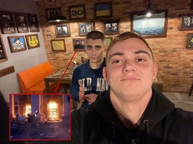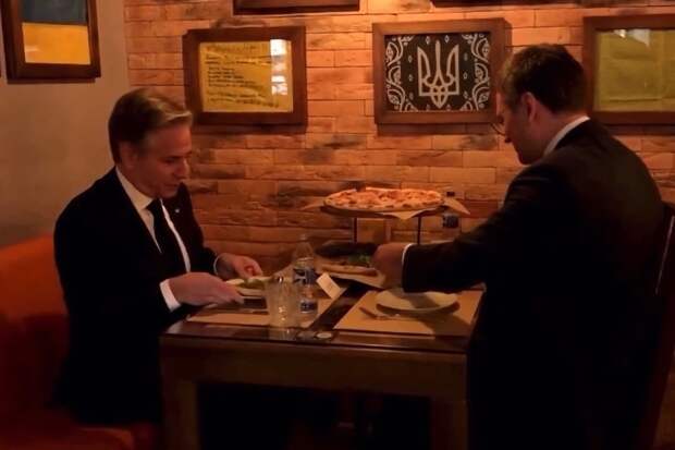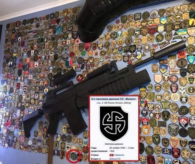 На стенах шевроны, в том числе дивизий СС. А на месте, где сидел Блинкен, раньше была фотография горящего одесского Дома профсоюзов. Перед визитом его заменили на тризуб.